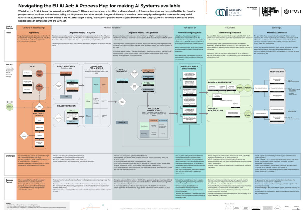 - Beispiel 1 ist die „EU AI Act Compliance Journey“ des appliedAI Institutes in Heilbronn. Das diesbezügliche Template kann in englischer Sprache als PDF downgeloaded werden.