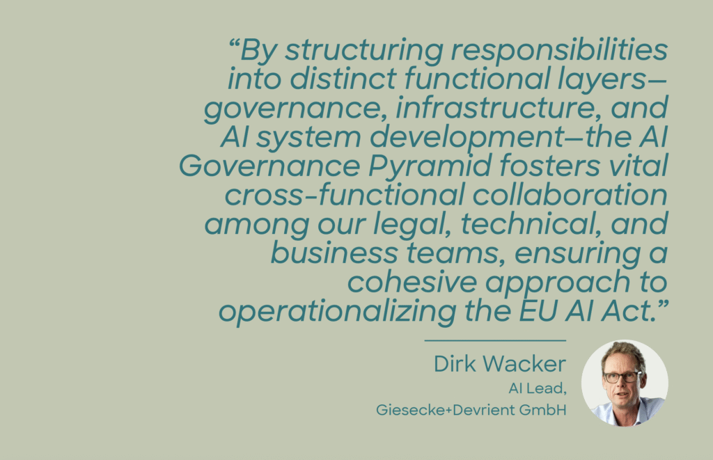 Das Schöne an dem Dokument sind auch die vielen Statements aus der Wirtschaft bzw. den Organisationen, welche die im Dokument beschriebenen Tools nutzen, um KI rechtskonform zu nutzen. Nachfolgend ein Screenshot mit einem Zitat von Giesecke & Devrient, das zugleich auf die Thesen zur Compliance Journey einzahlt. Die Message: Ohne cross-funktionale Kollaboration geht es nicht!