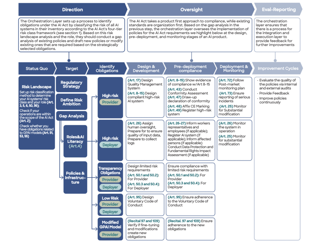 - PDF-Dokument: Auf der Intro-Site befindet sich ein Formular zum freien Download des Best-Practice-PDFs. Das Dokument umfaßt 60 aufschlussreiche Seiten. Darin enthalten ist u.a. eine Beschreibung des AI Act Governance Pyramid Framework. Es basiert auf der Kombination unterschiedlicher Governance-Layer (siehe Bild oben).
